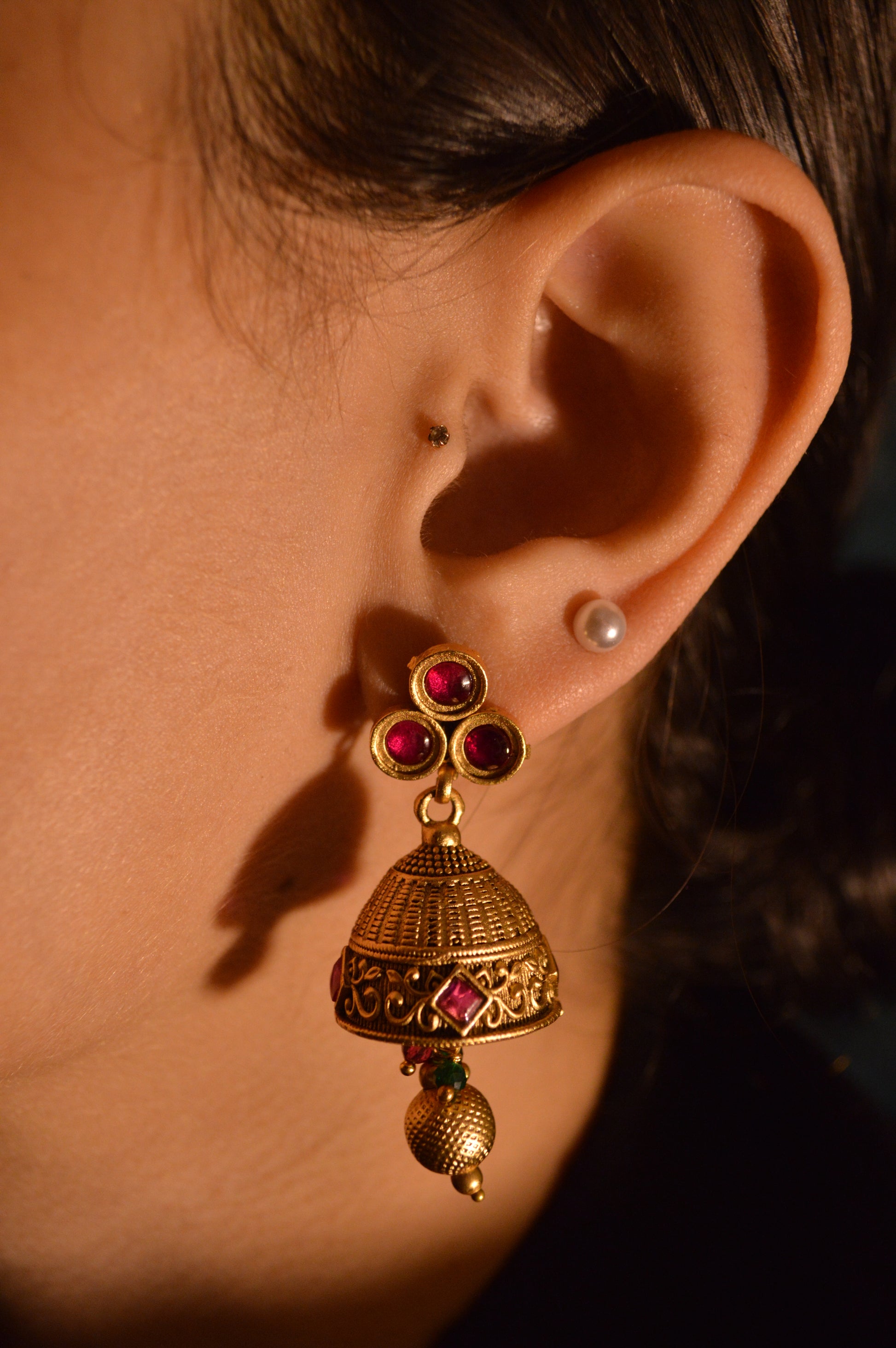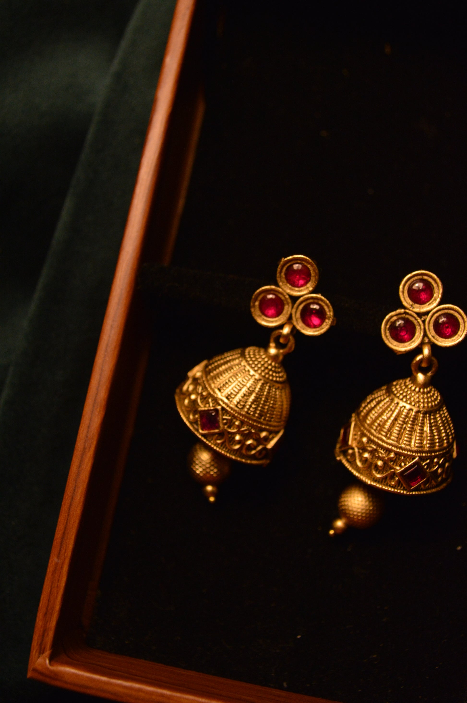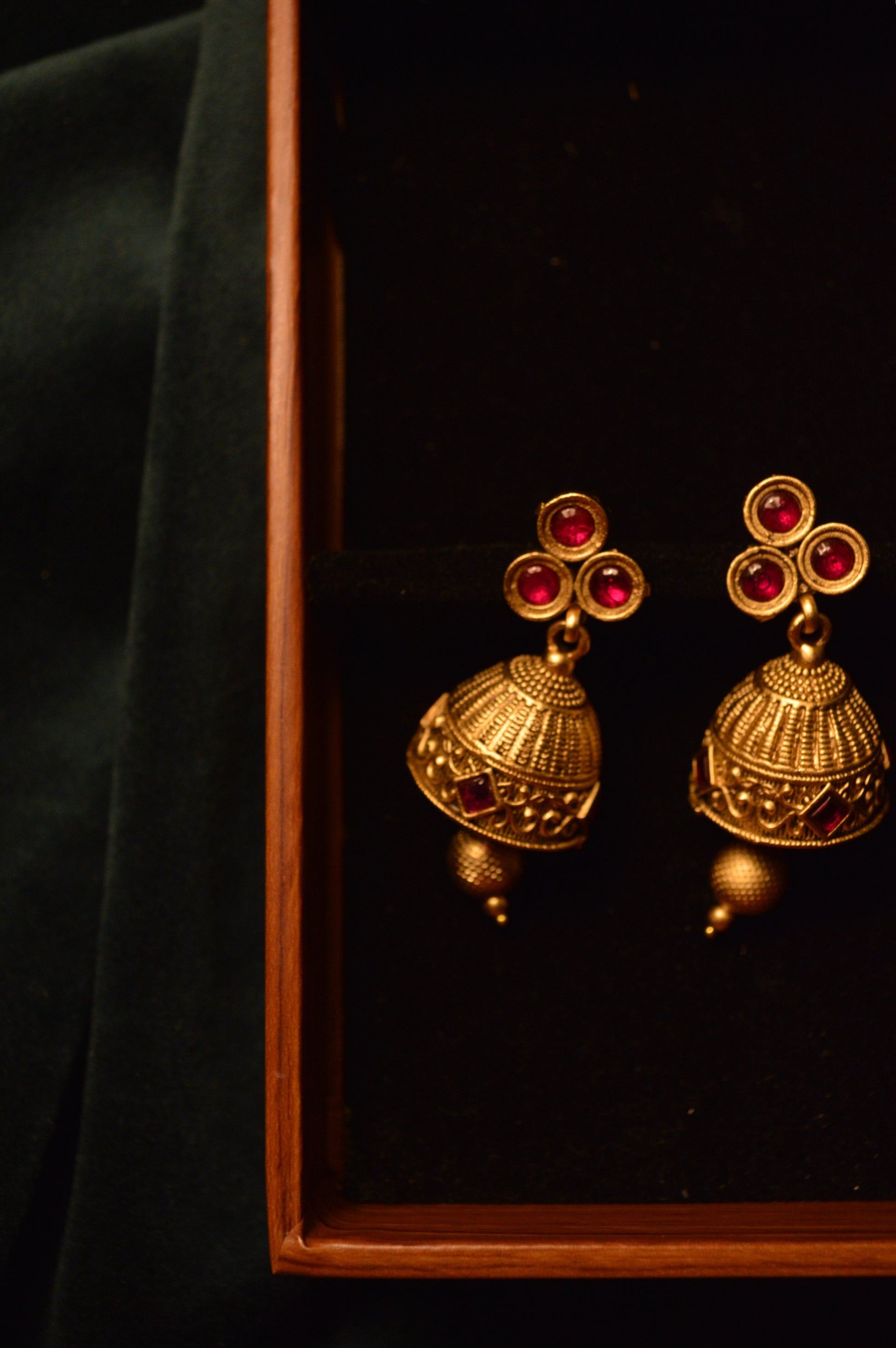 Exquisite Rajhistani jhumkis meticulously handcrafted from brass, elegantly polished to a matte gold finish.