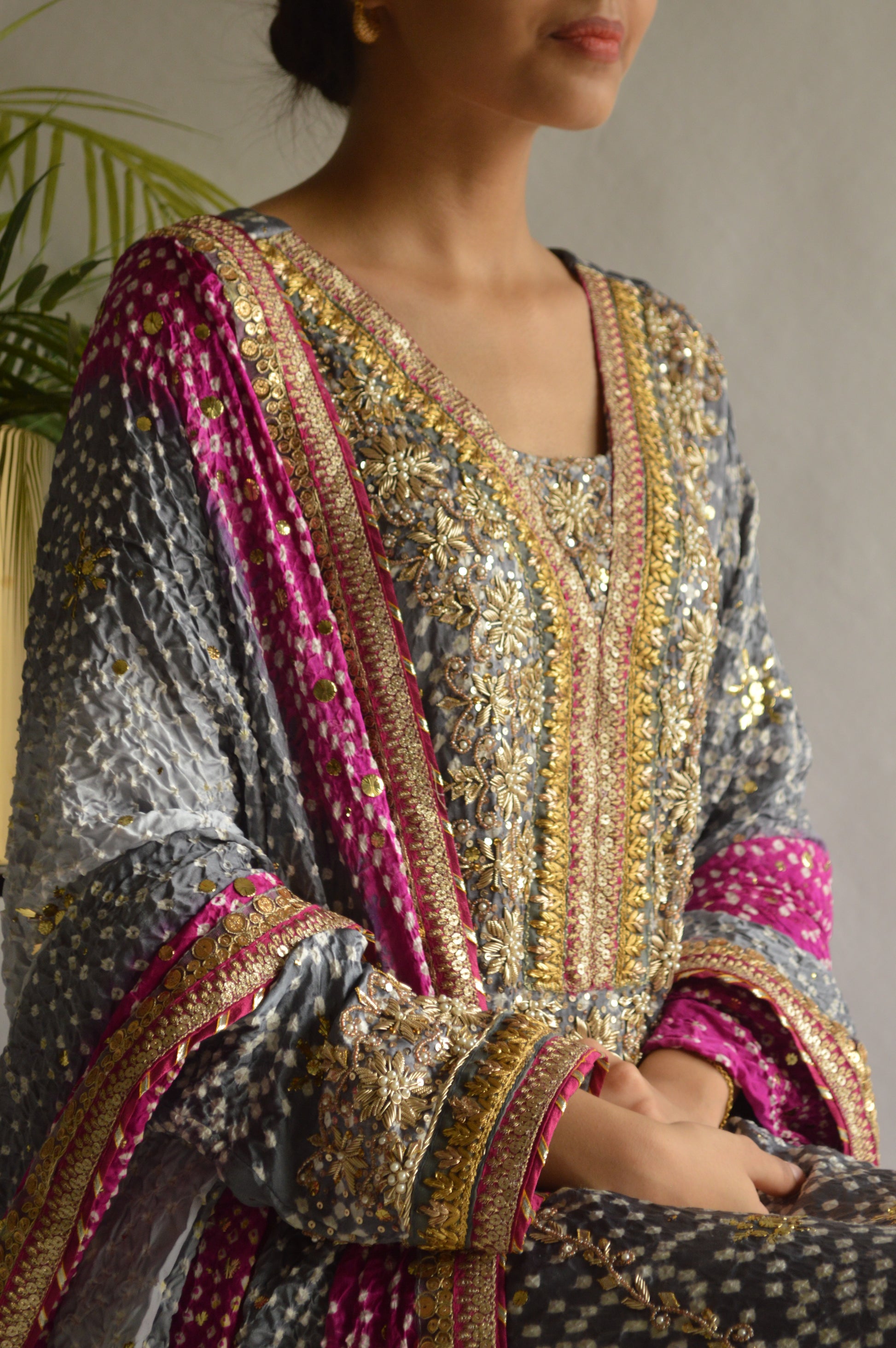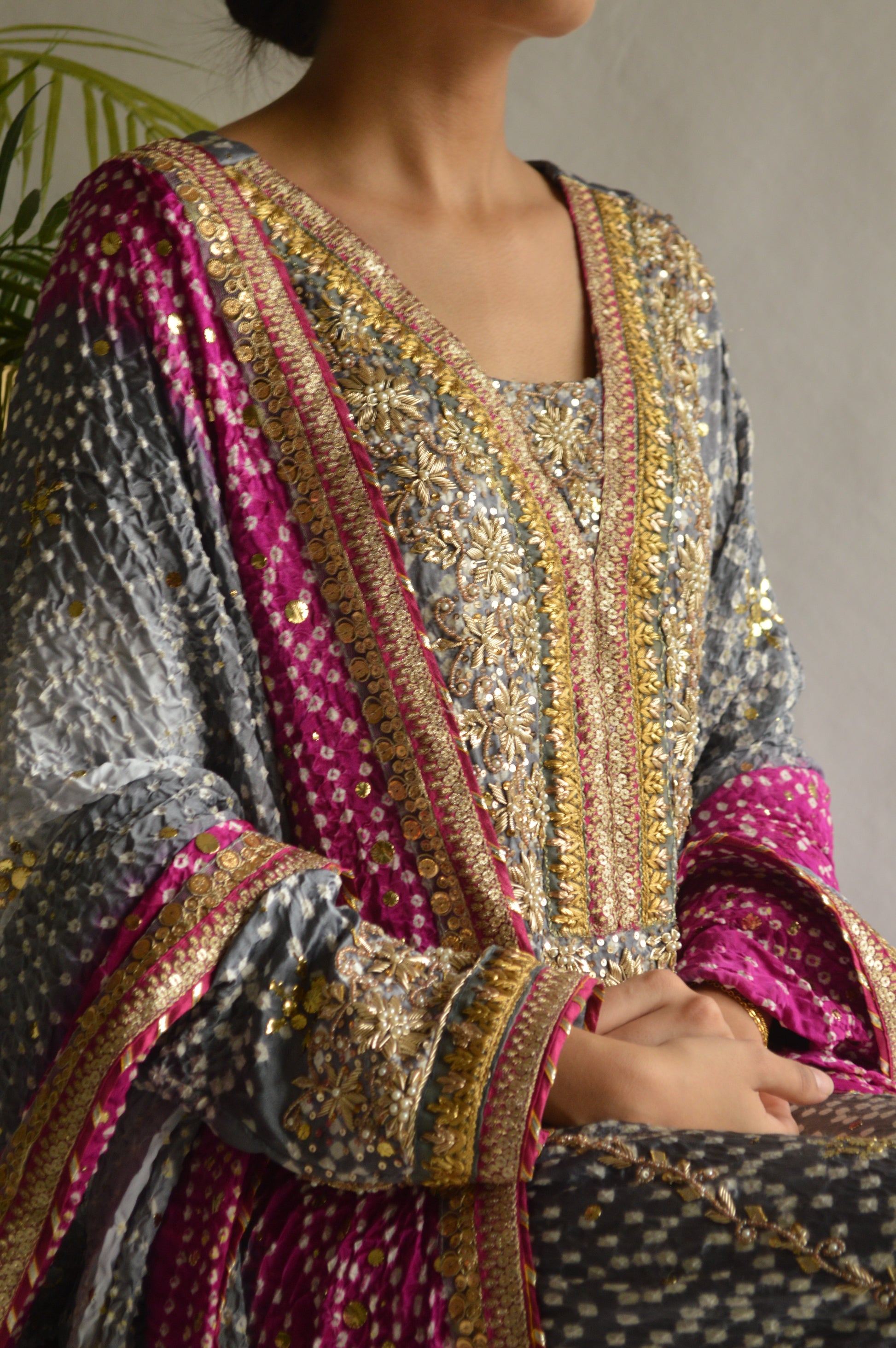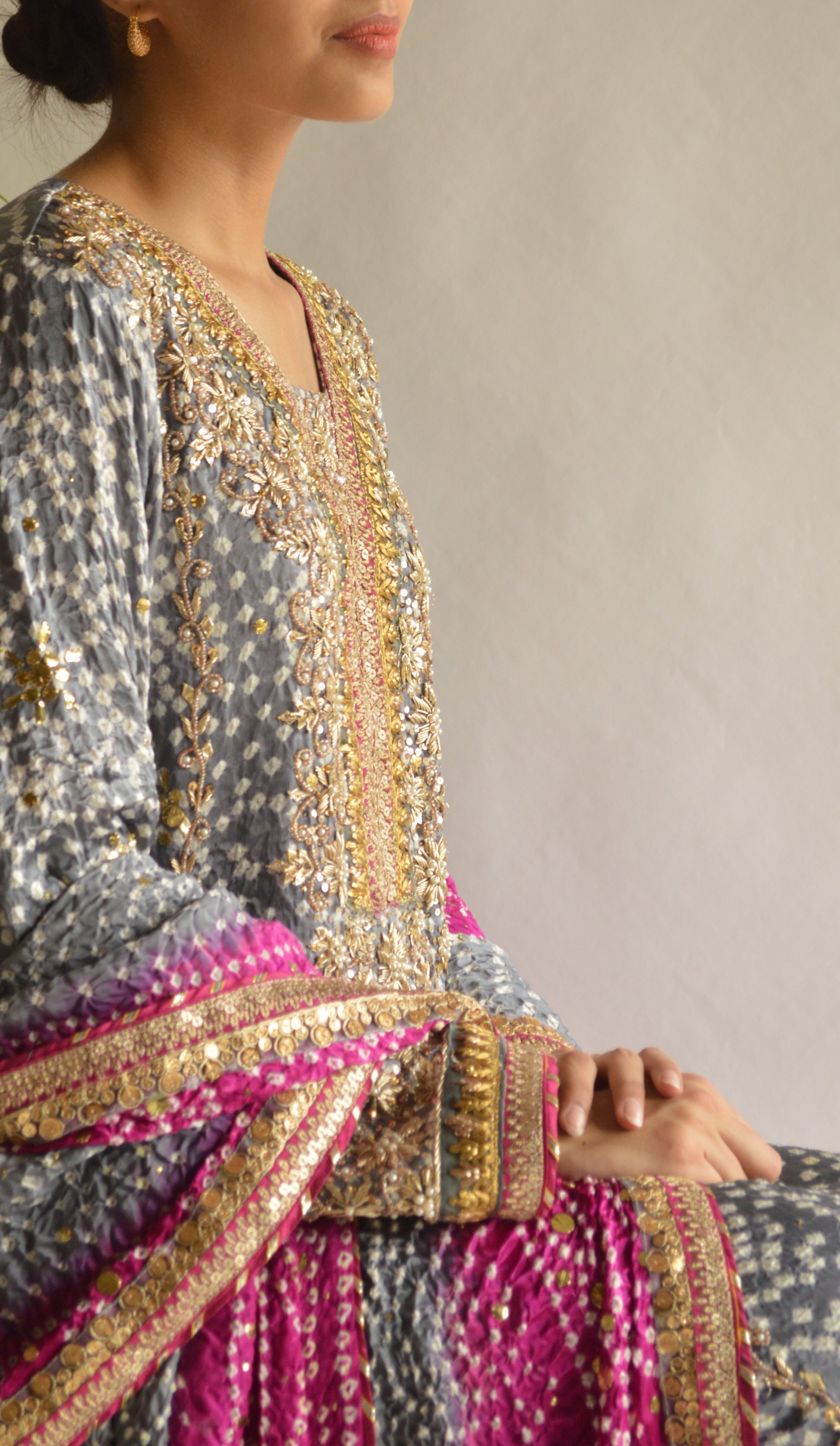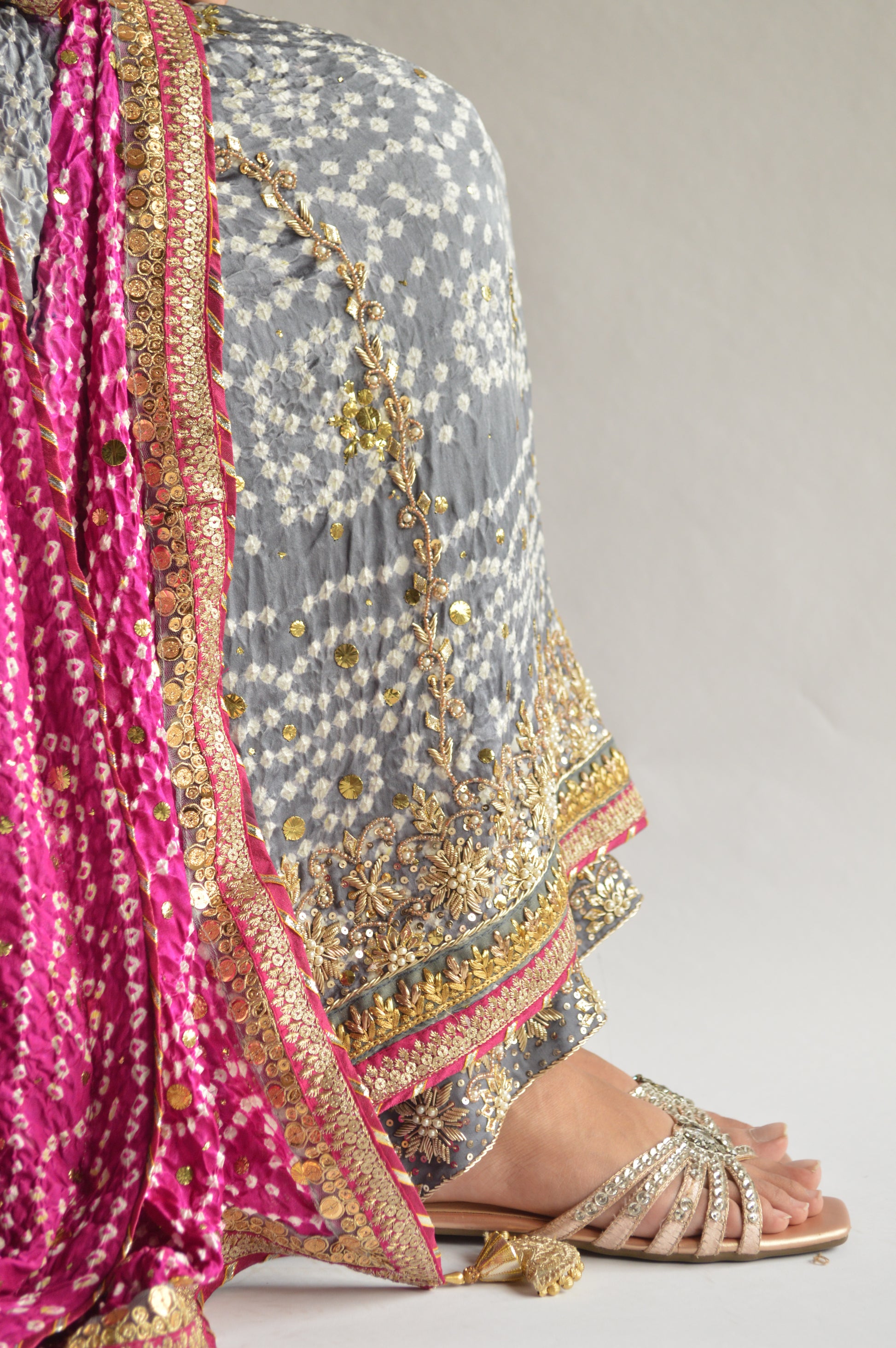 3 piece, stitched, pure charmeuse silk chunri suit with dabka and kaamdani embellished with laces.