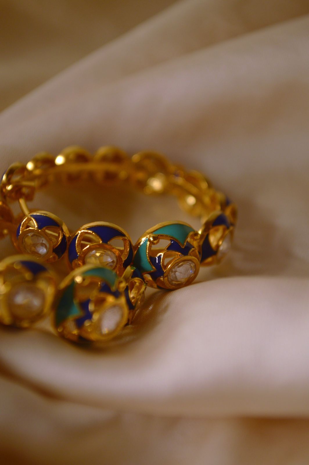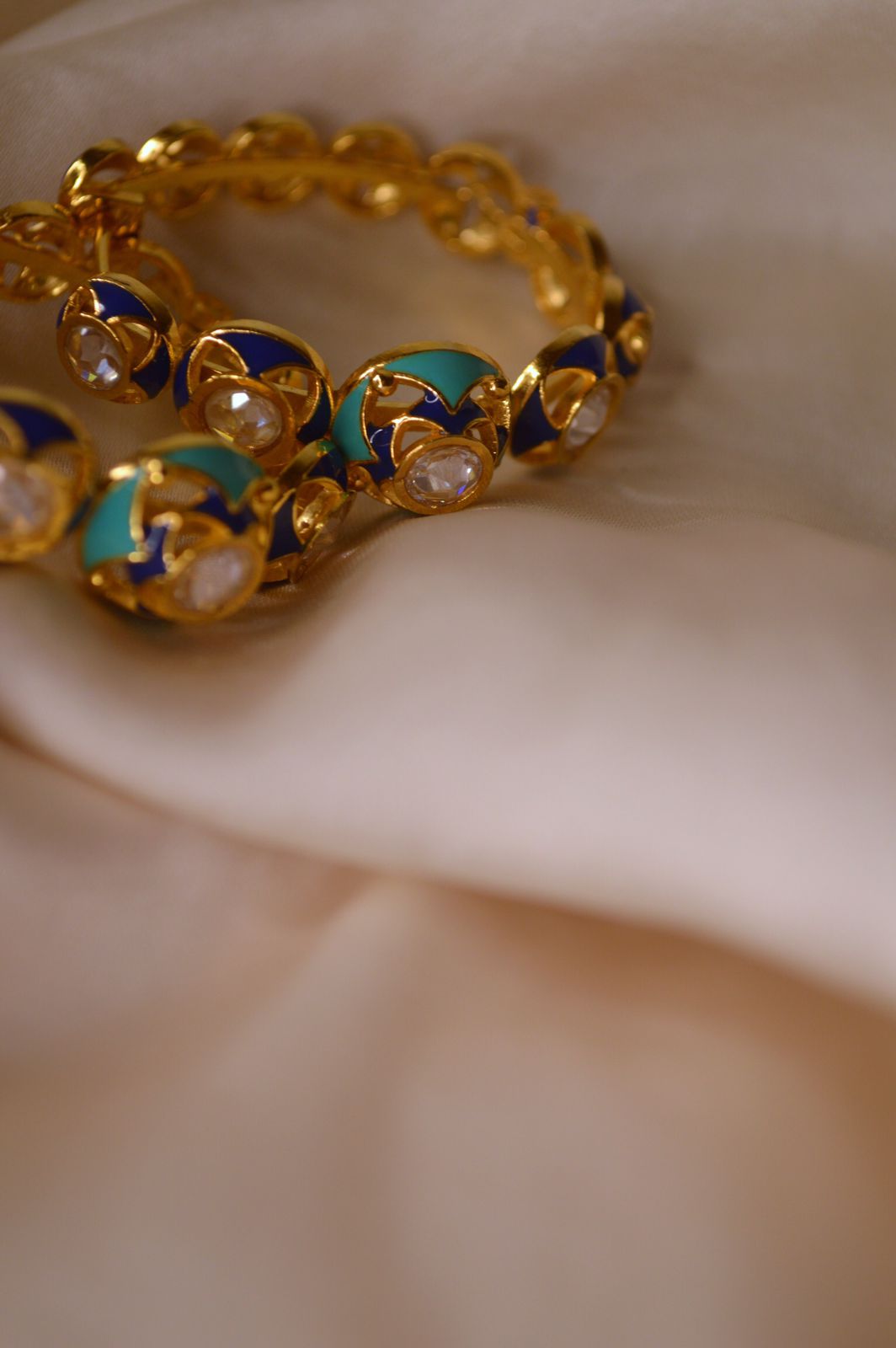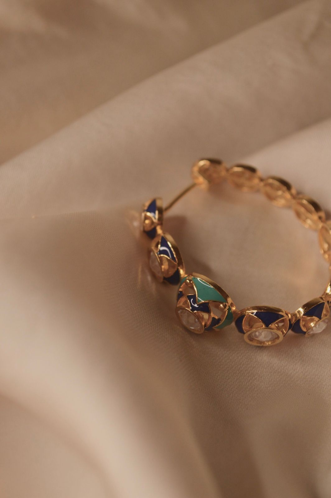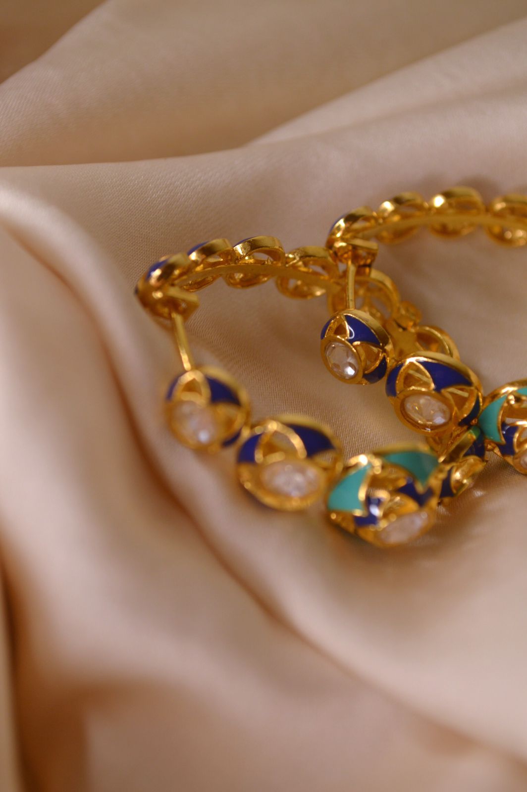 Handcrafted silver hoops adorned with intricate Meena work in captivating shades of blue, embellished with zircons.