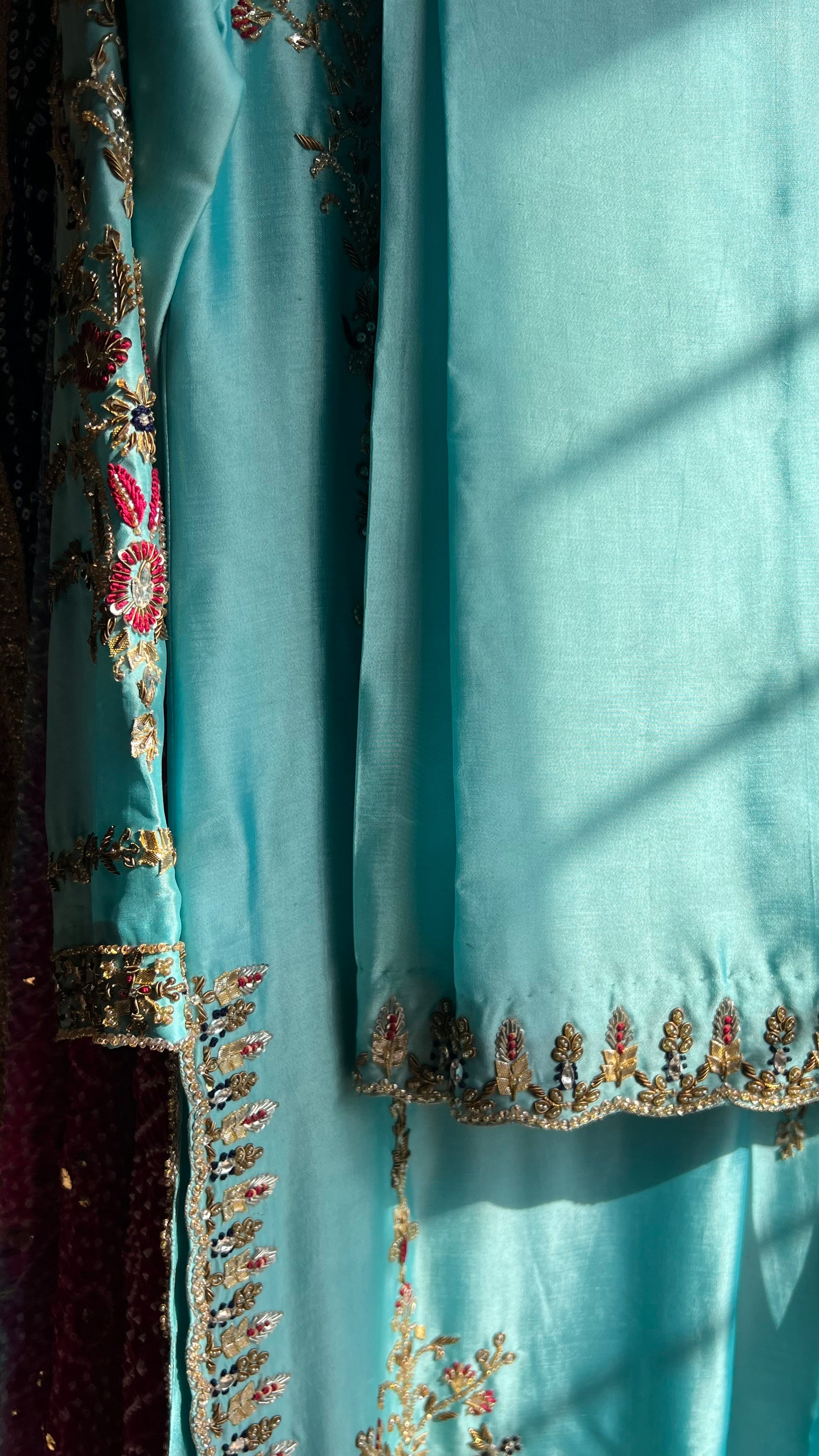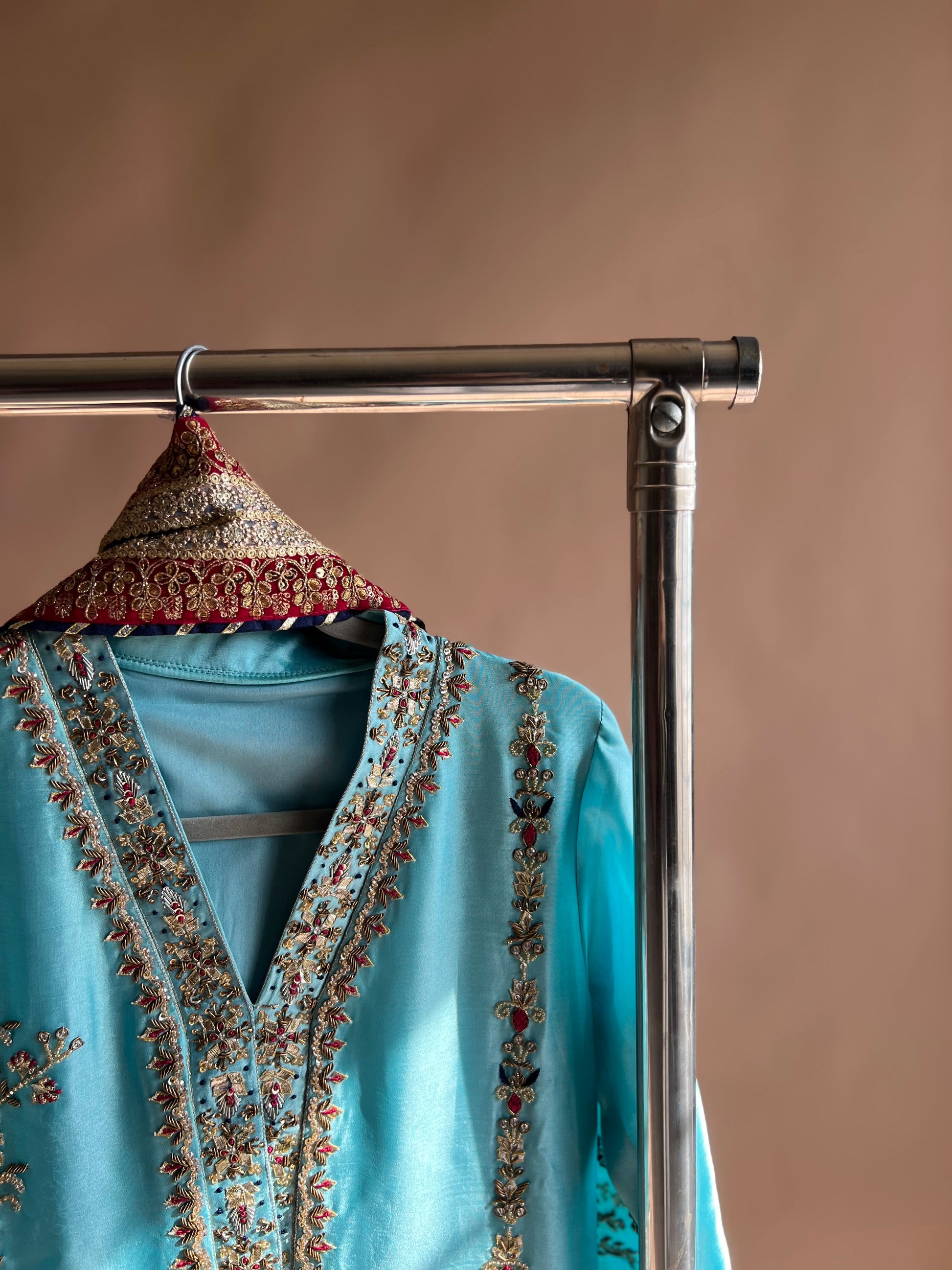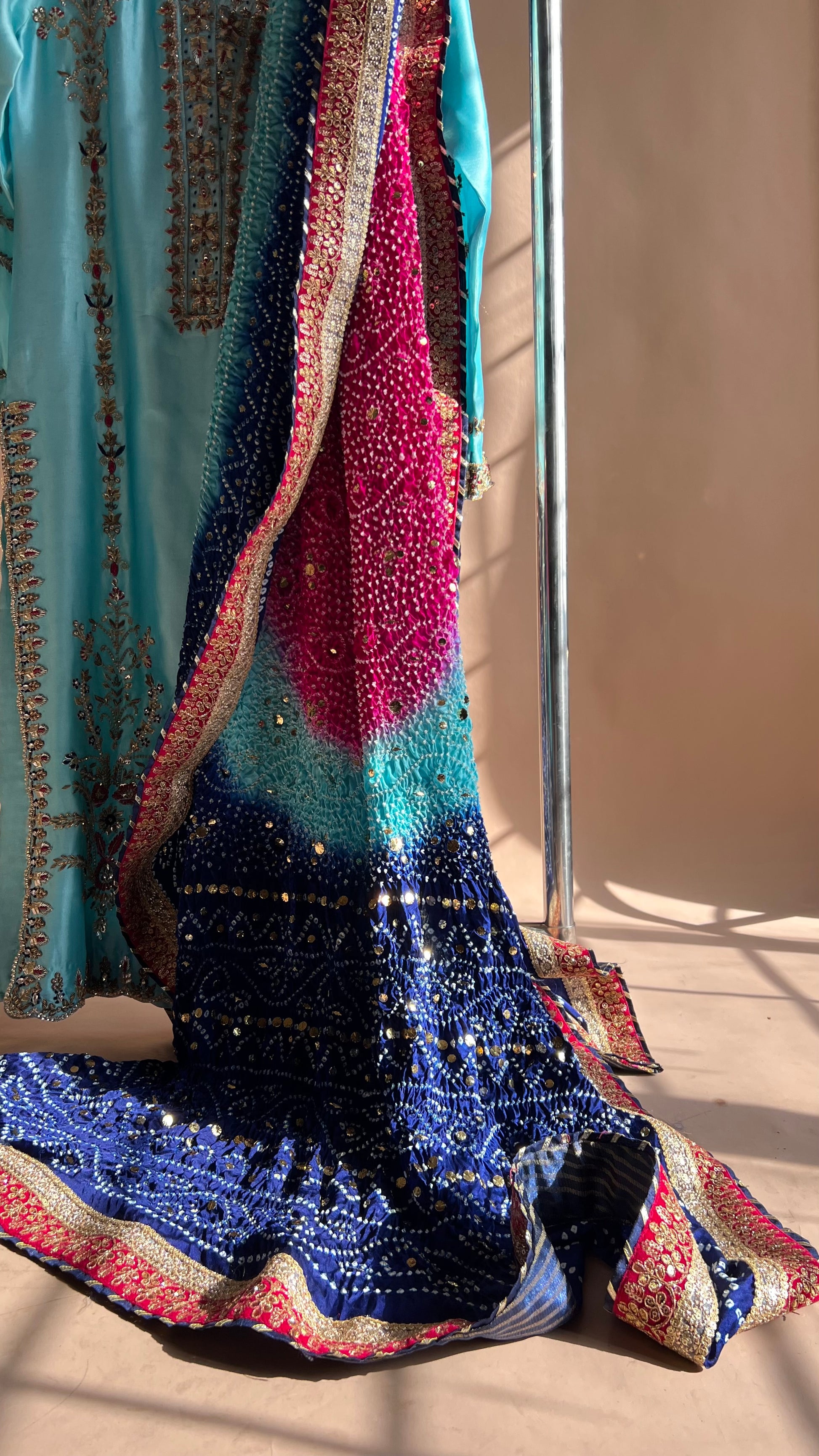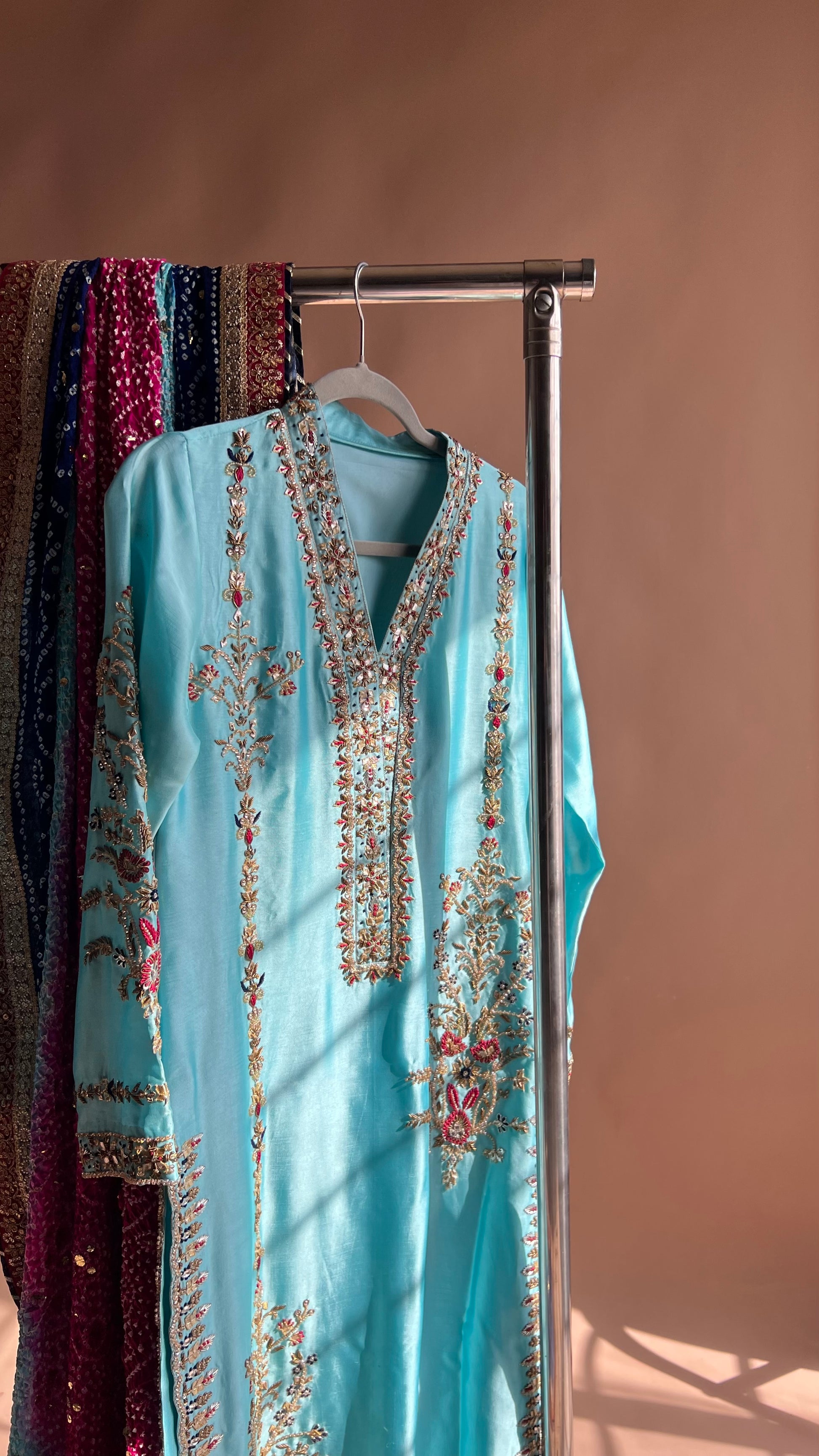 A three piece stitched silk ensemble adorned with exquisite handcrafted embroidery, paired with a pure charmeuse Silk Chunri Dupatta with Kamdani and Finishing.