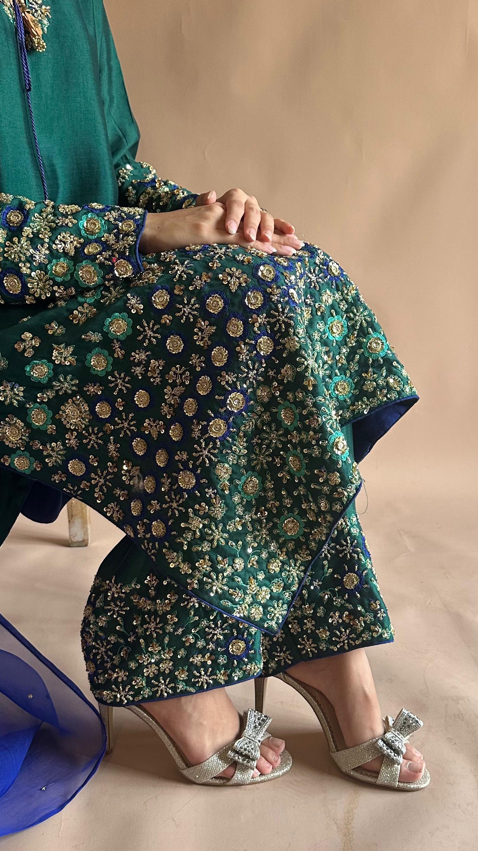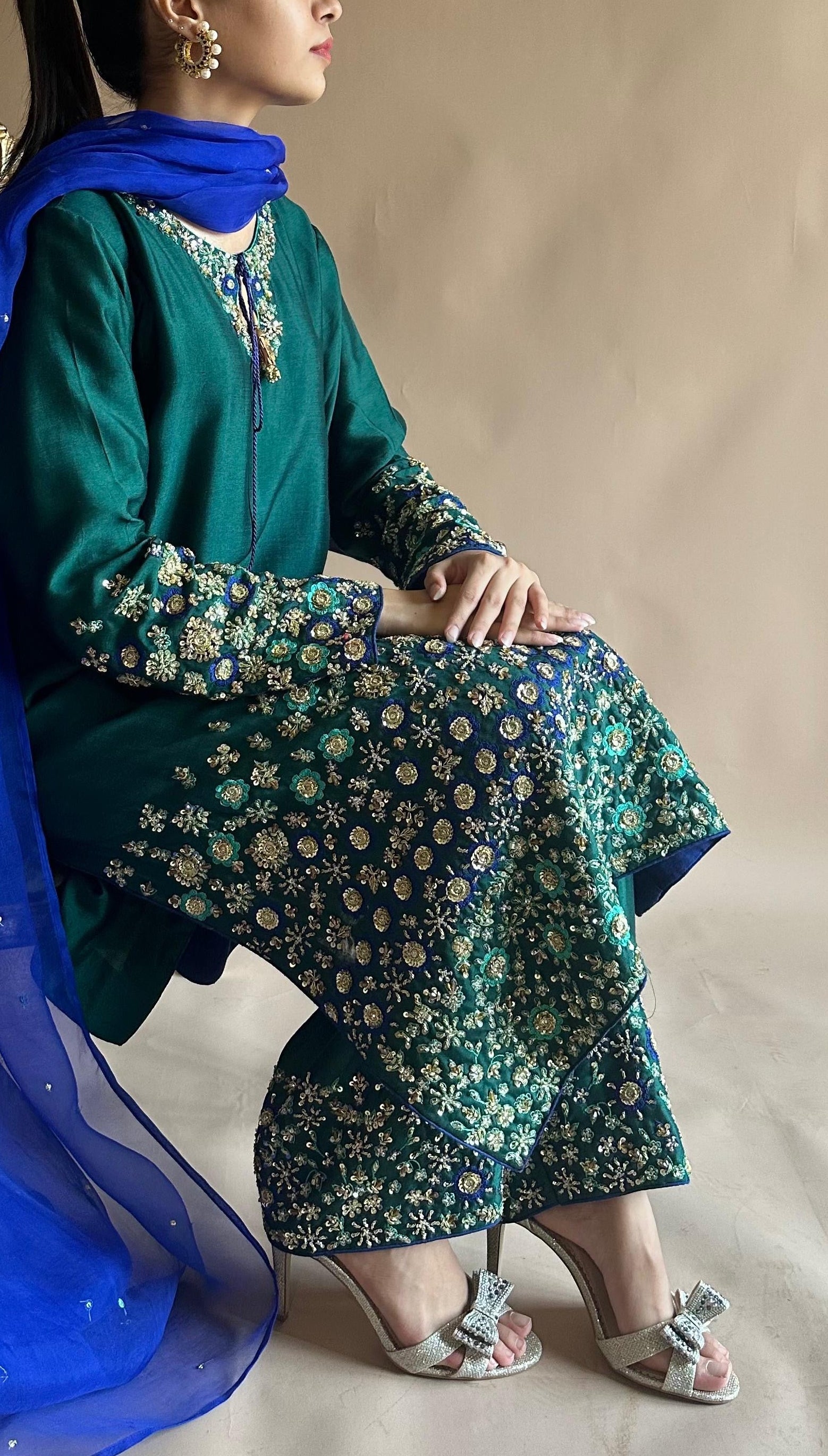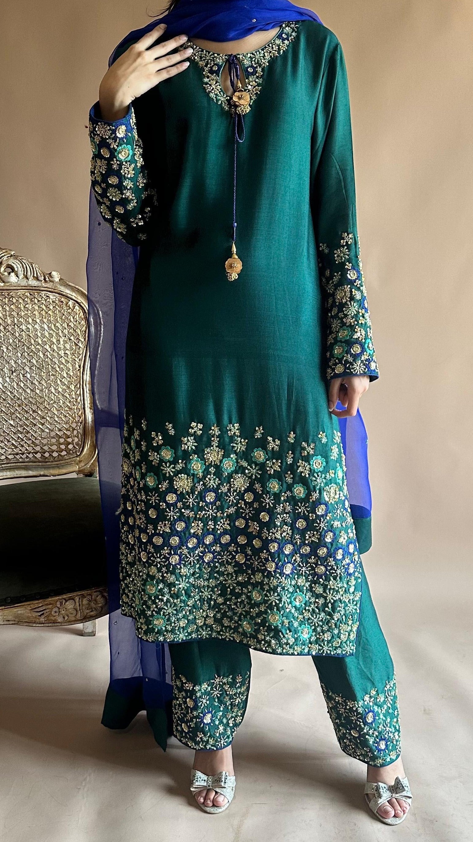 All handwork on Korean raw silk stitched suit paired with pure organza duppatta