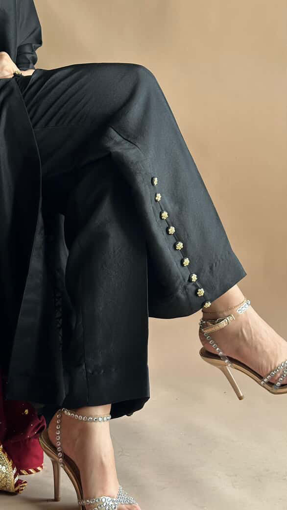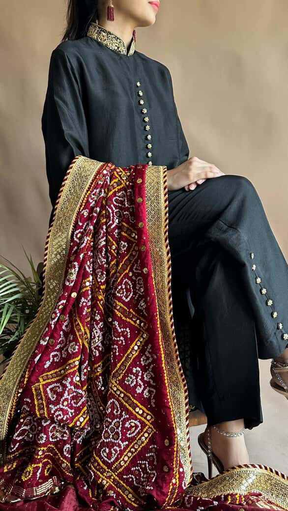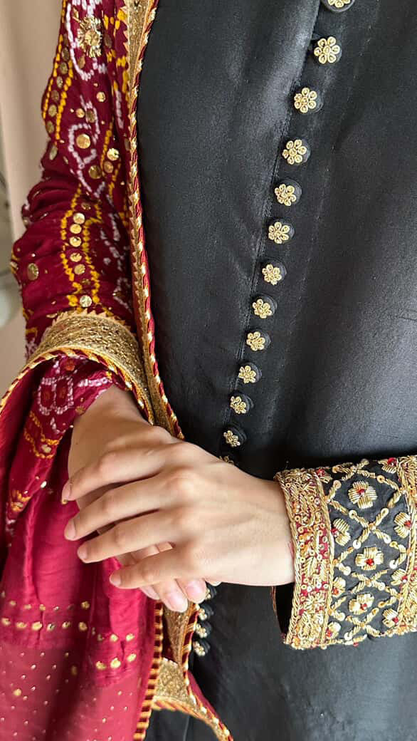 Sherwani-style tailored shirt featuring intricate handwork on the cuffs and collar, complemented by handcrafted buttons on both the shirt and trousers. Paired with a rich Gajji silk Chunri dupatta adorned with delicate Kamdaani detailing and fine finishing.