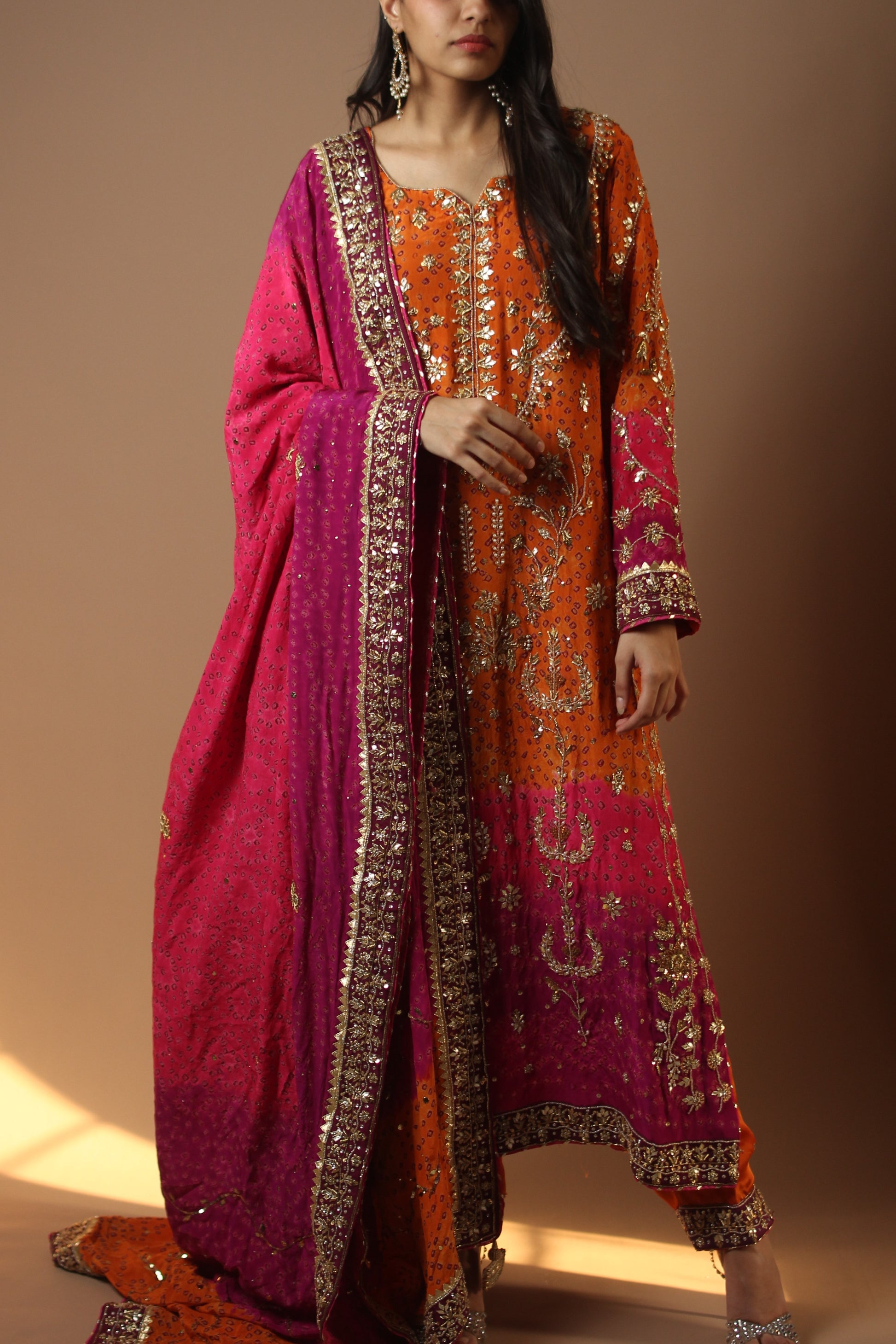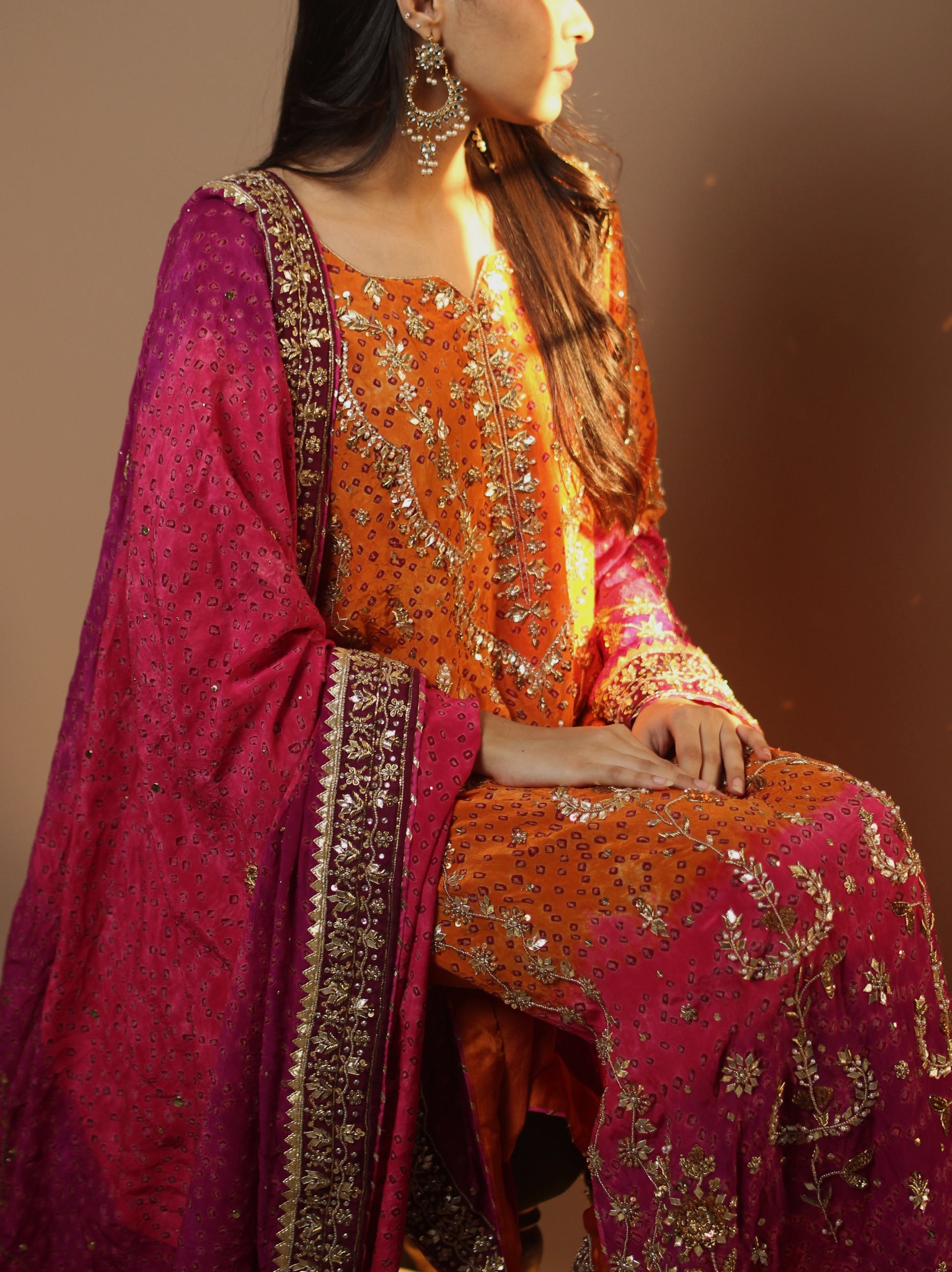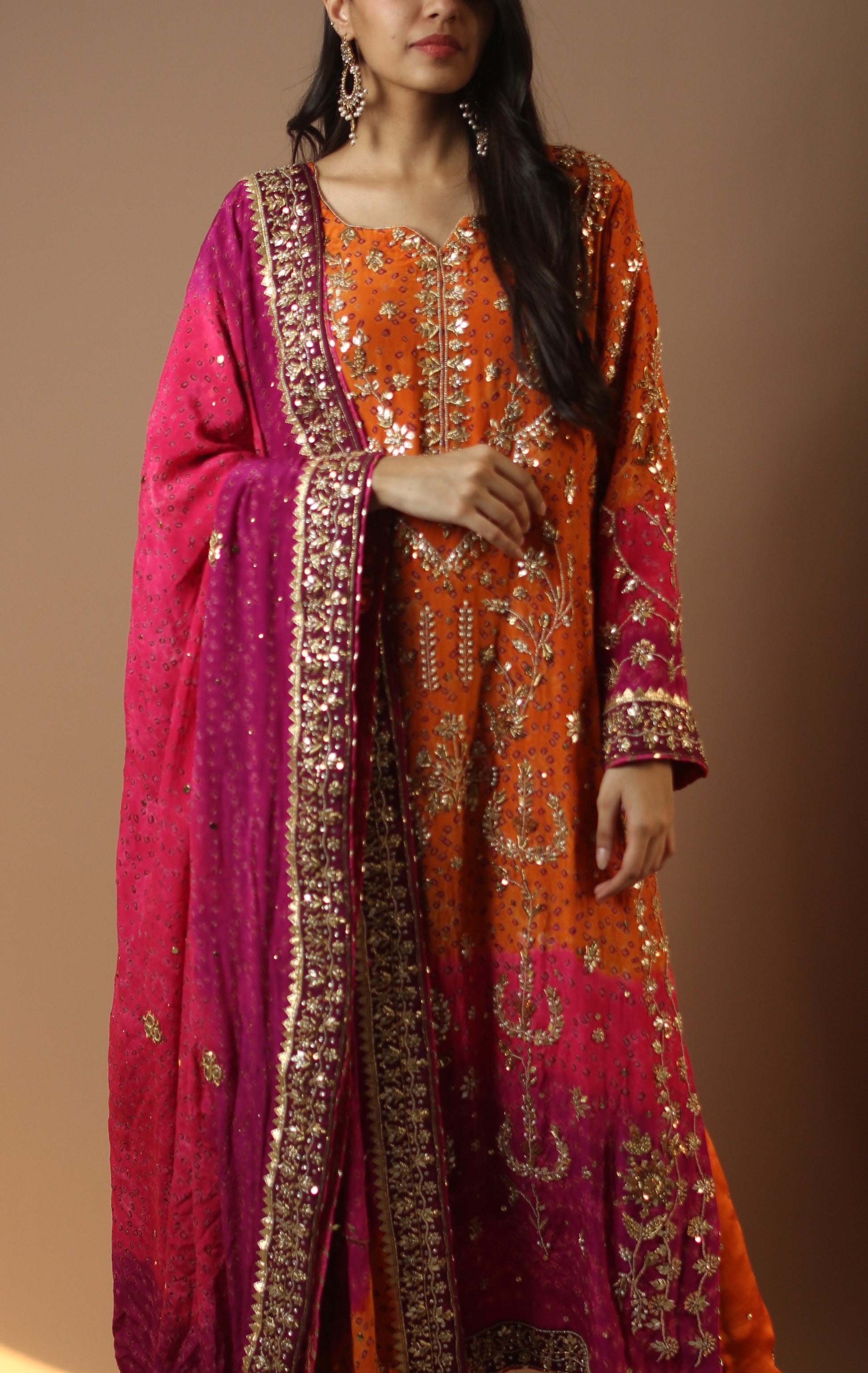 A 3 piece stitched, pure charmeuse suit with dabka work on the shirt , trouser and duppatta.