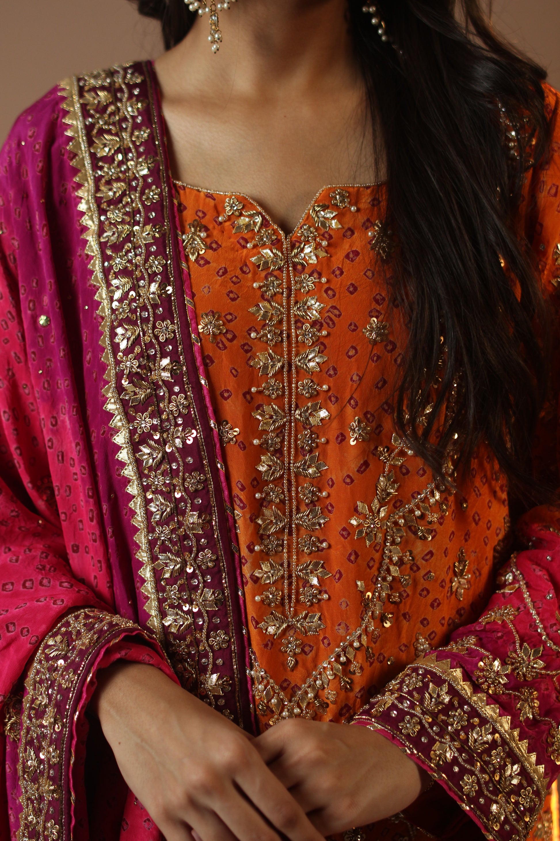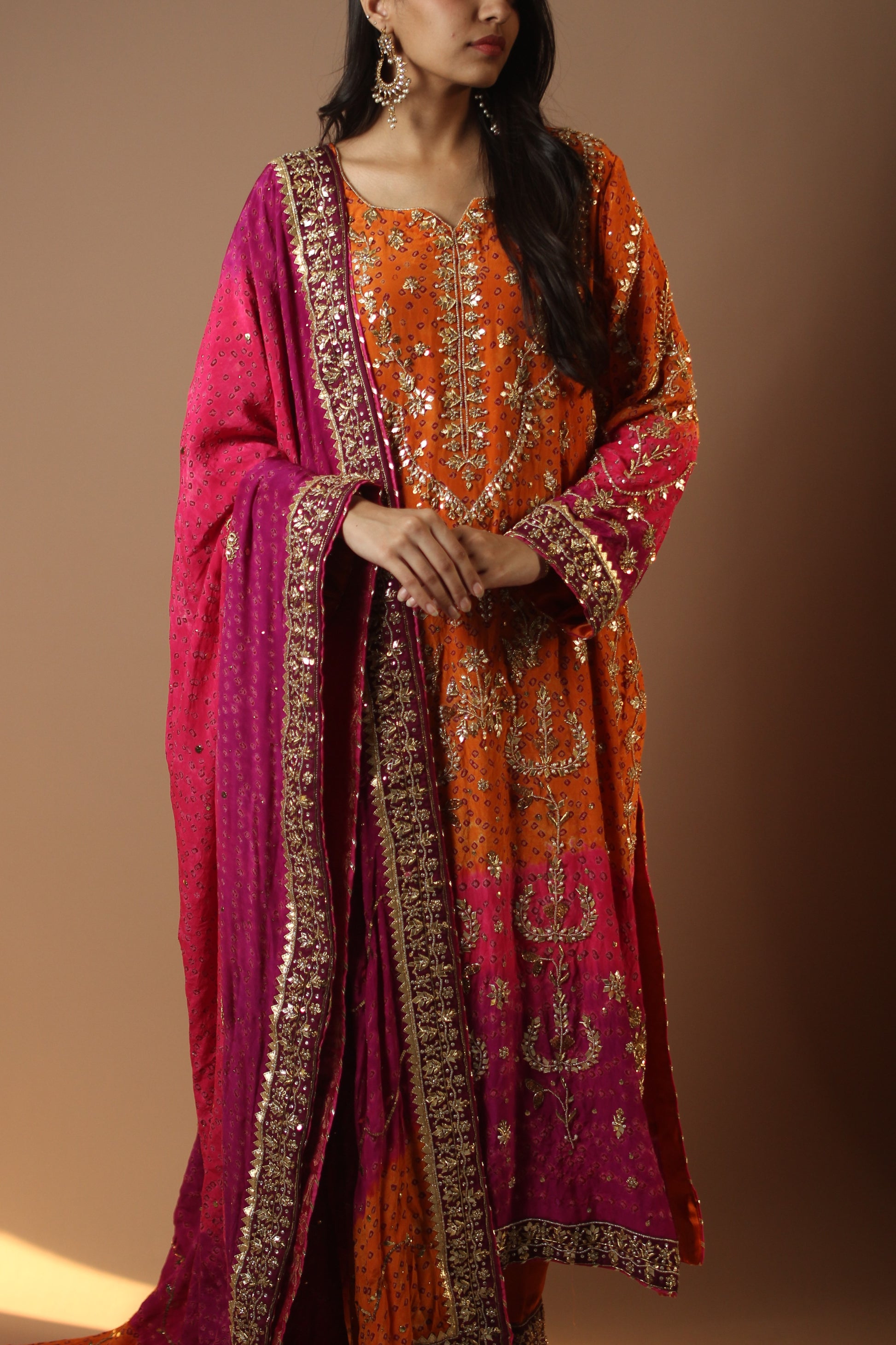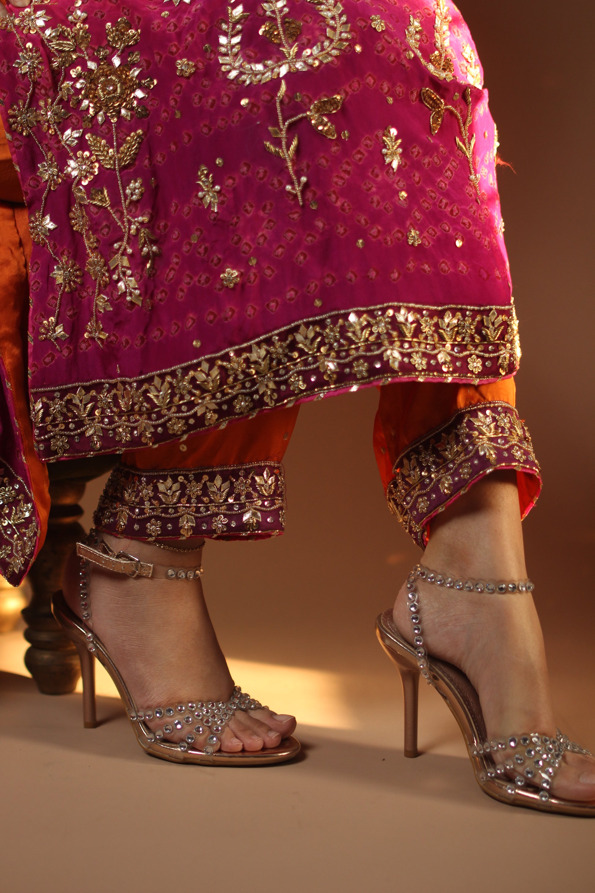 A 3 piece stitched, pure charmeuse suit with dabka work on the shirt , trouser and duppatta.