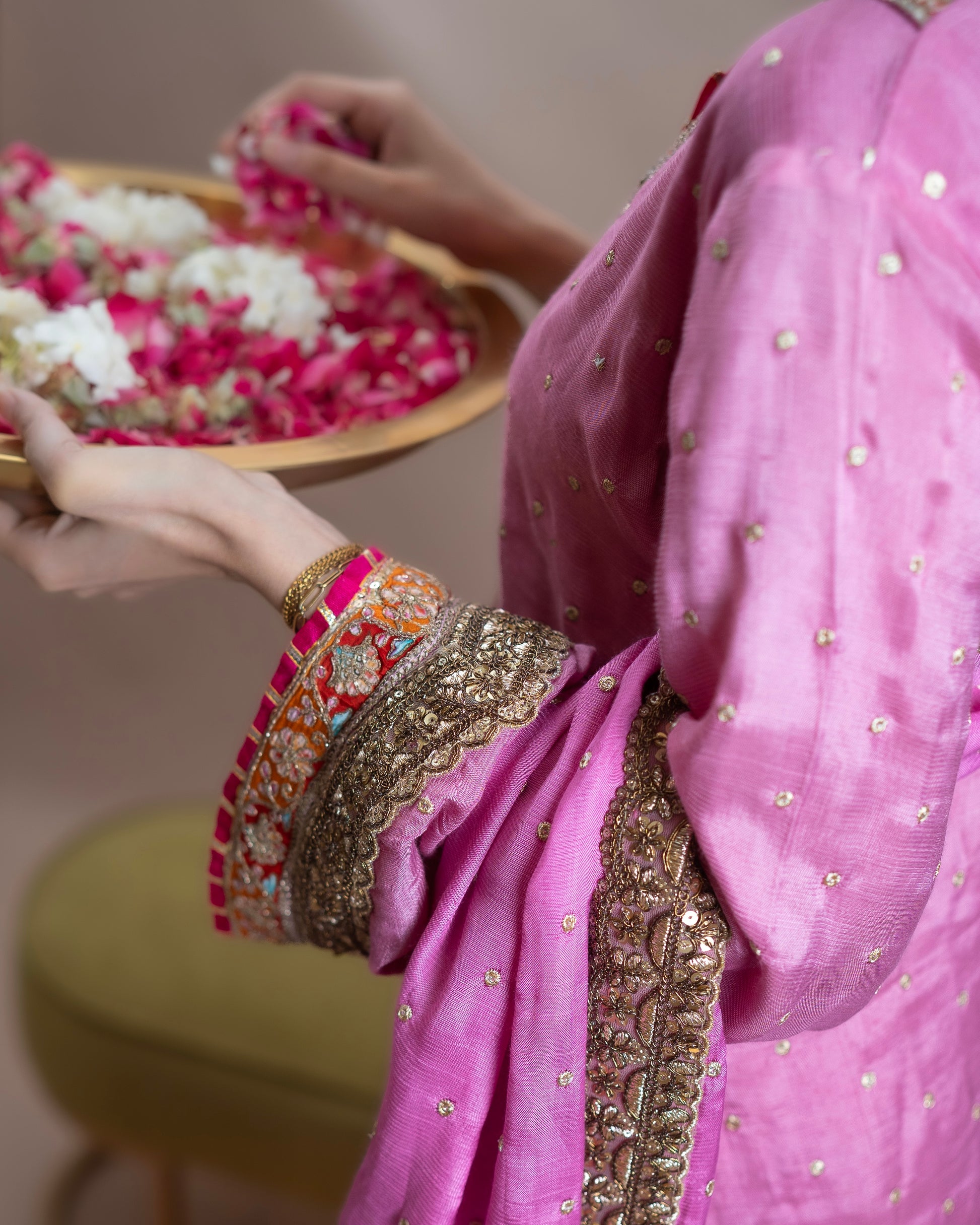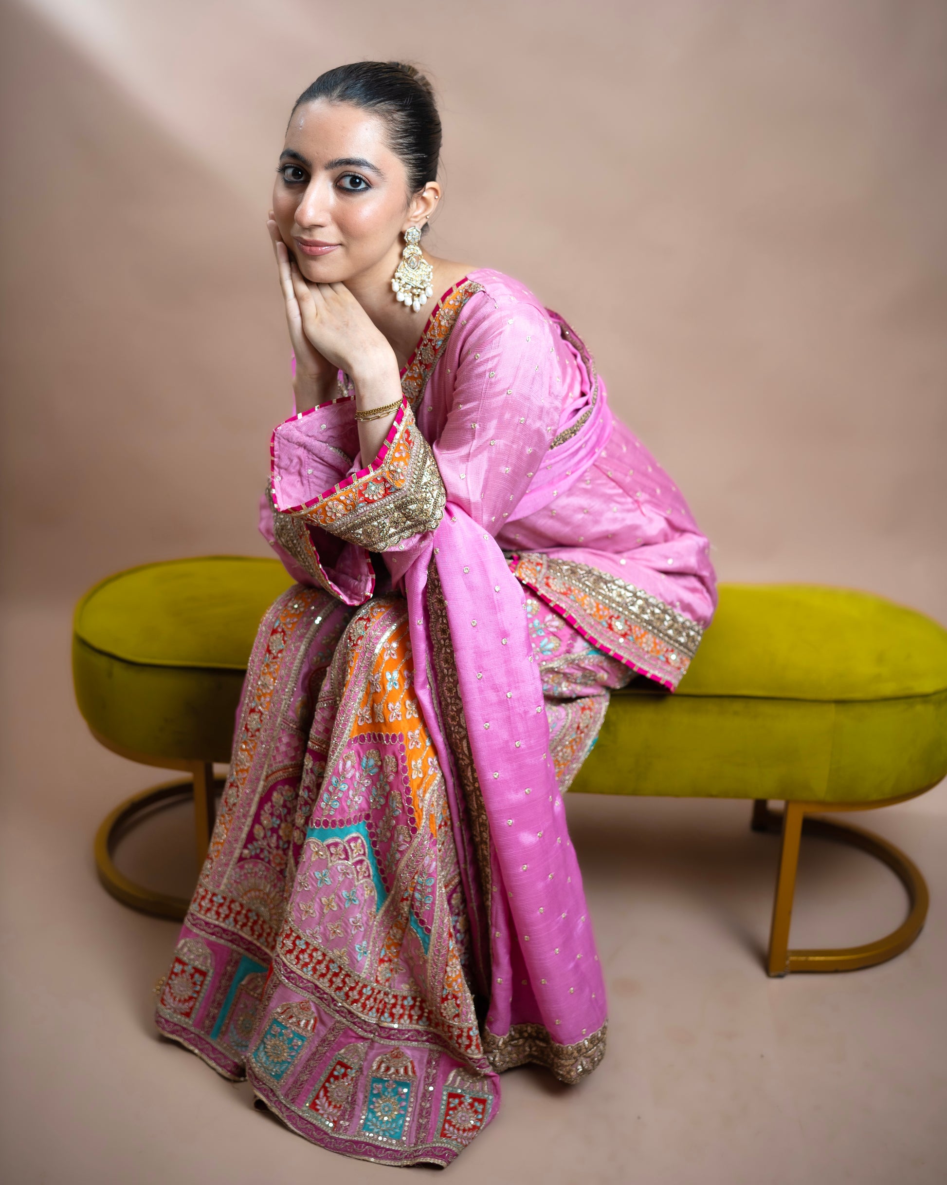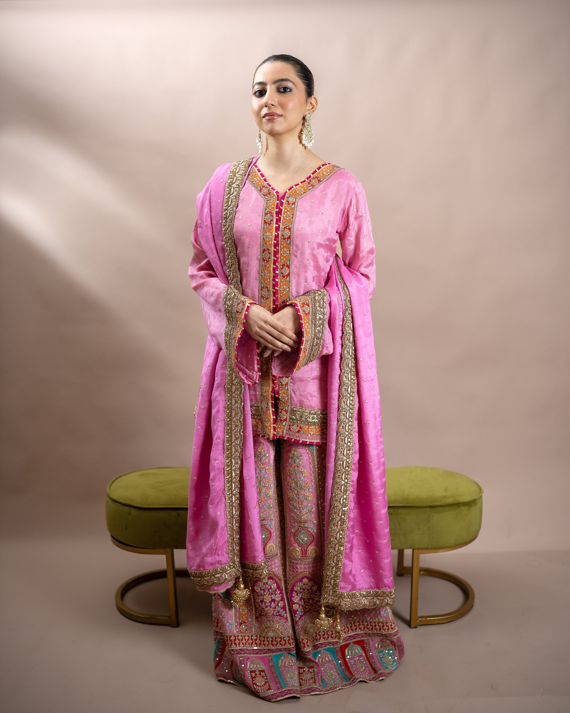 Bubblegum coloured Dhaka pajama featuring all-over embellishments, paired with a silk buti top adorned with appliqué detailing and delicate lace accents